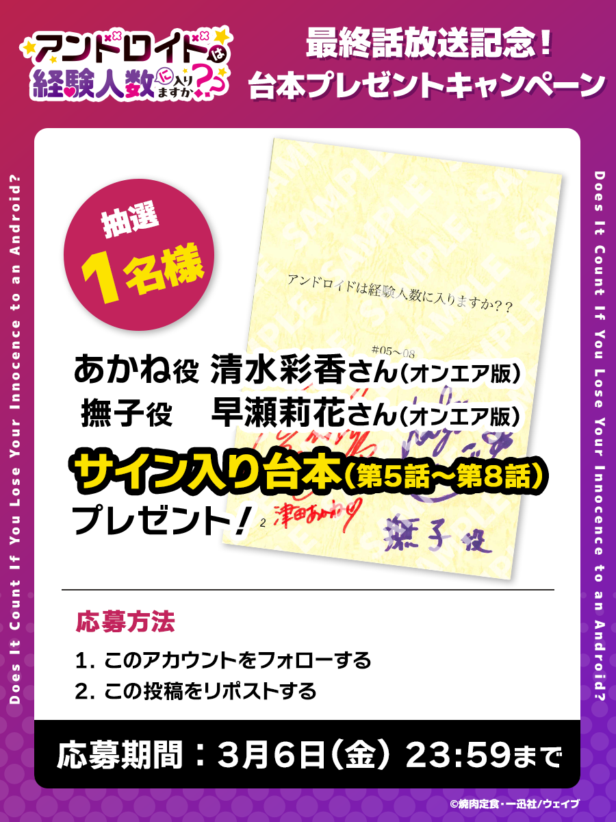 『アンドロイドは経験人数に入りますか??』TVアニメ公式X(@hanisuka_anime)をフォロー・該当のポストをリポストしていただいた方の中から抽選で1名様に「サイン入り台本#05~#08」をプレゼント!